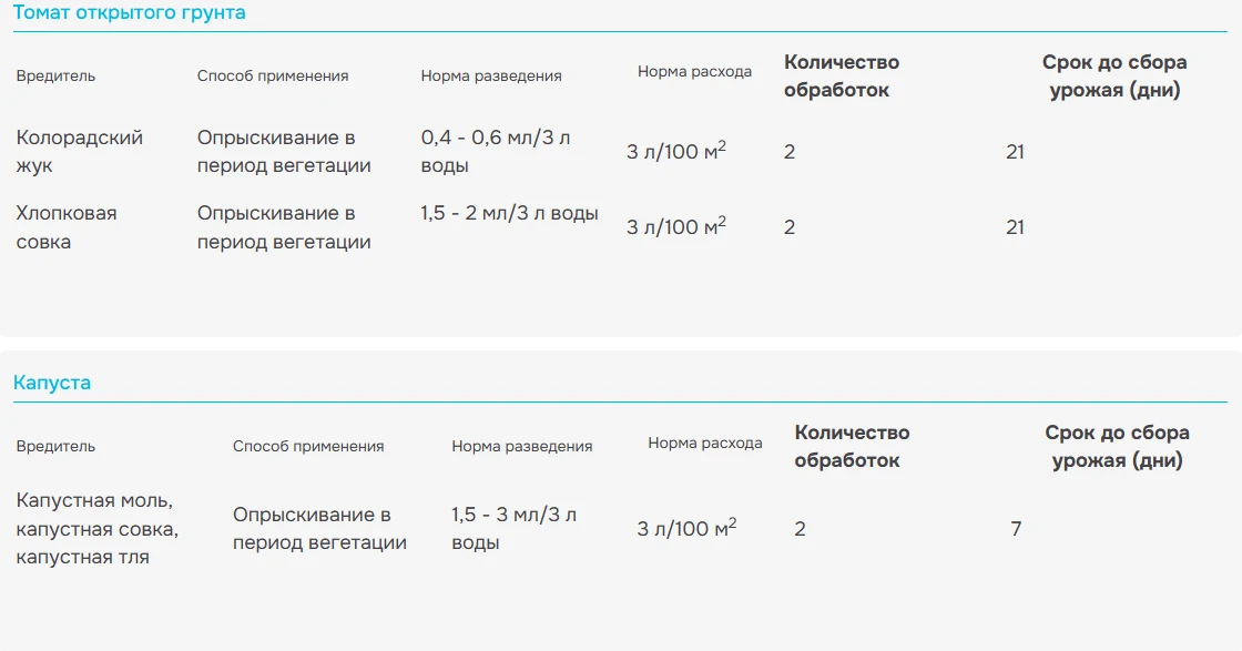 Гибель вредителей в течение 1-3 дней после обработки в зависимости от вида и фазы развития насекомого.