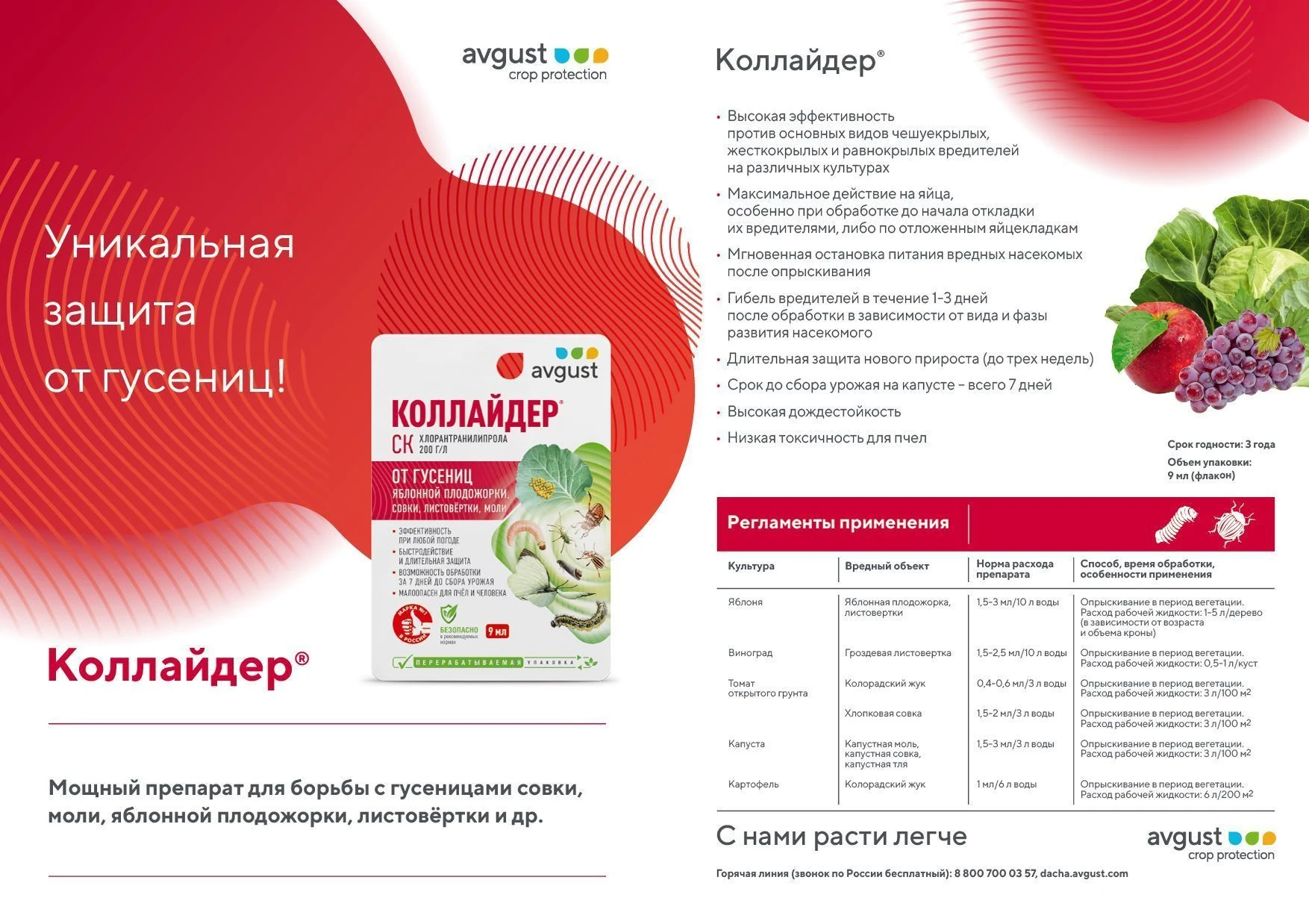 Высокая эффективность против основных видов чешуекрылых, жесткокрылых и равнокрылых вредителей на различных культурах.