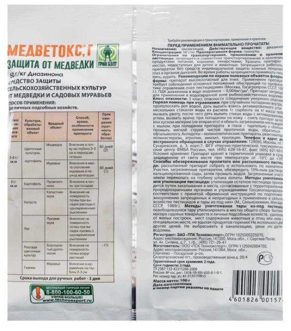 Для гибели вредителя достаточно поедания одной гранулы Медветокса.