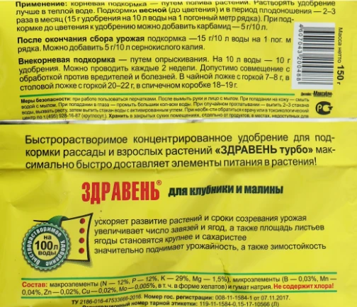Здравень Турбо для клубники и малины – быстрорастворимое концентрированное удобрение.