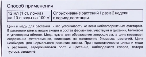 Zn–1%, Cu–1%, Fe–0,02%, B–0,0014%, Mn–0,018%, Мg–0,0025%, Mo–0,004%, Co–0,0008% в хелатной (легкоусвояемой) форме.