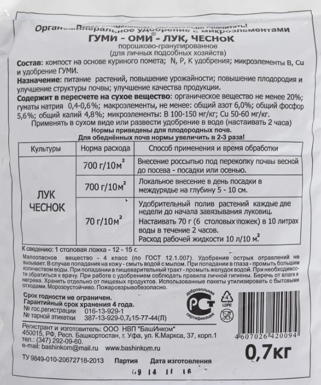 Применяется в качестве основного внесения и корневой подкормки для лука и чеснока.