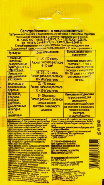N-13,5%, K2O-45,8%, B-0,003%, Zn-0,003, Cu-0,003%, Mn-0,013%, Ca-0,013%, Fe-0,019%, Mo-0,0007%.