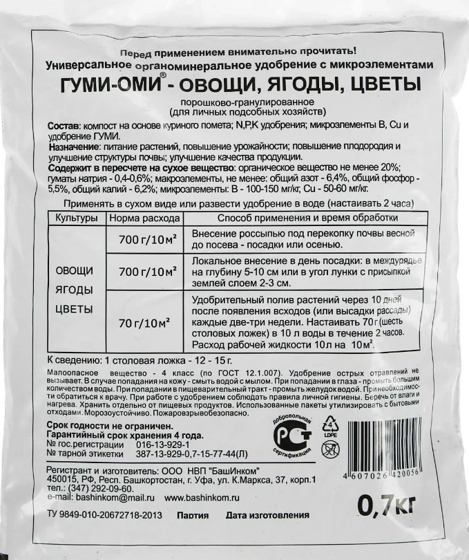 Порошково–гранулированное удобрение с необходимыми для питания растений макро- и микроэлементами и эликсиром плодородия Гуми.