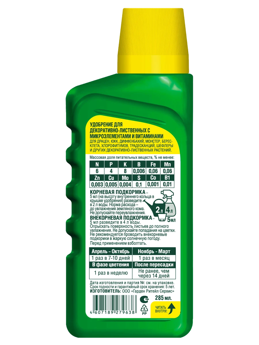 Содержит сбалансированный набор питательных веществ необходимых для активного роста комнатных декоративных растений