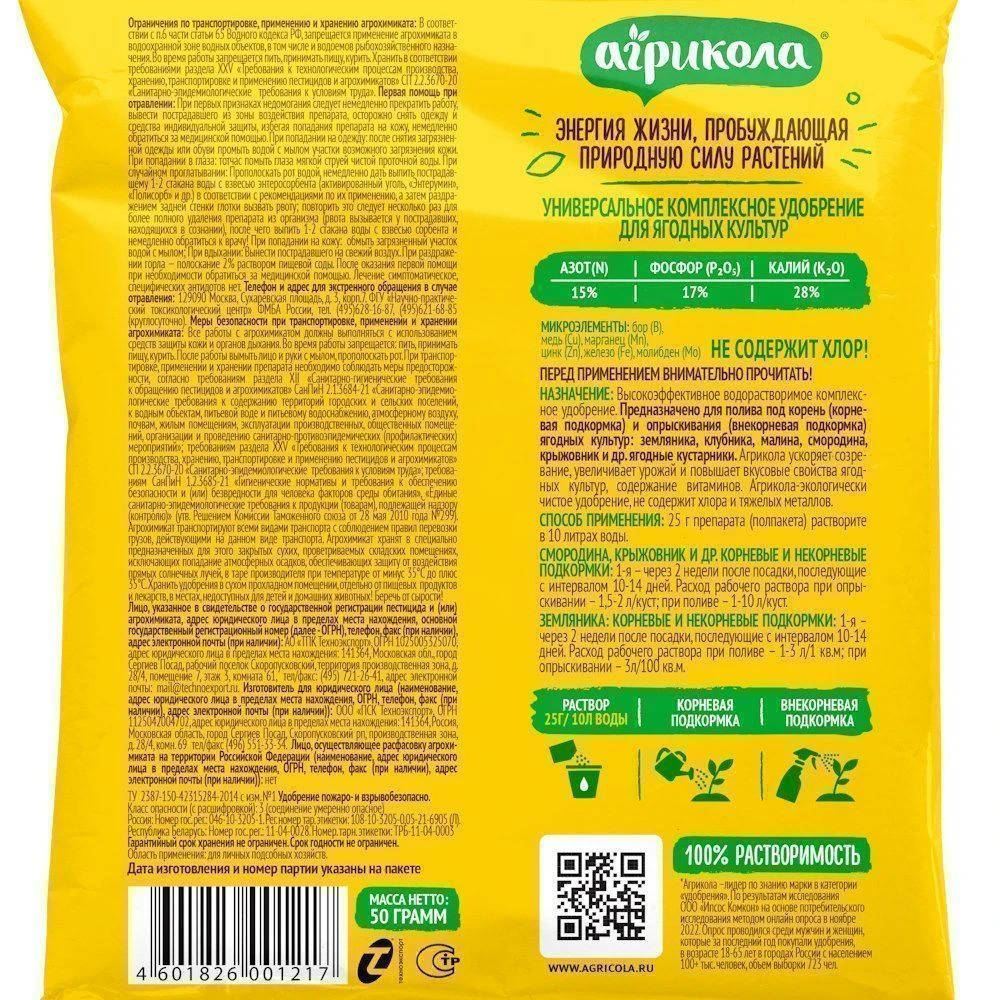 Количество товара в упаковке 100 ШтрихКод 4601826001217 Назначение удобрения или грунта Для плодово-ягодных культур Торговая марка Агрикола Форма выпуска Гранулы Вид удобрения Минеральные -