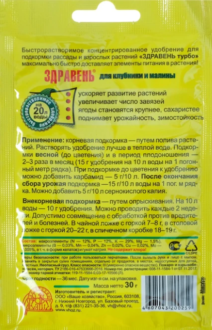 Здравень Турбо для клубники и малины – быстрорастворимое концентрированное удобрение.