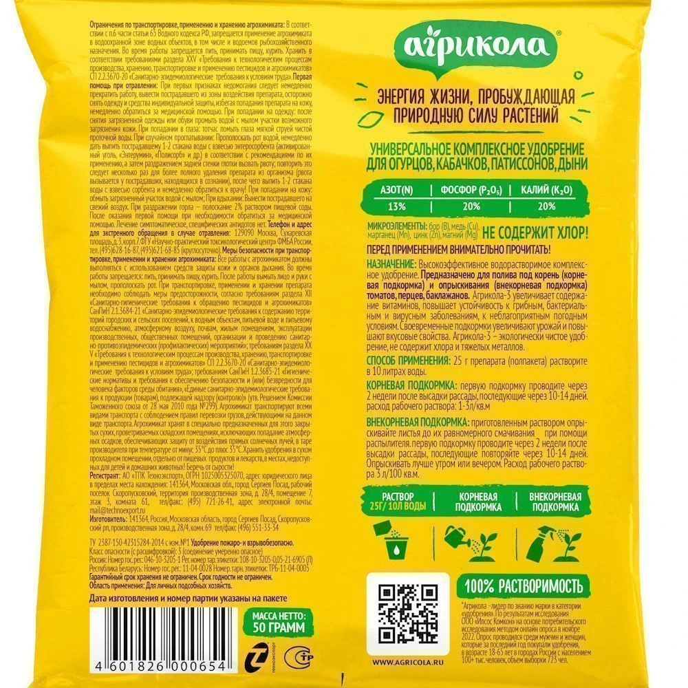 Количество товара в упаковке 100 ШтрихКод 4601826000654 Назначение удобрения или грунта Для овощей Торговая марка Агрикола Форма выпуска Гранулы Вид удобрения Минеральные -