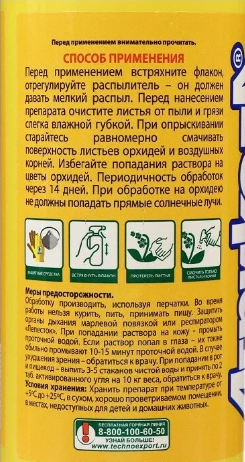 Готовый к применению раствор для опрыскивания листьев и корней орхидей.