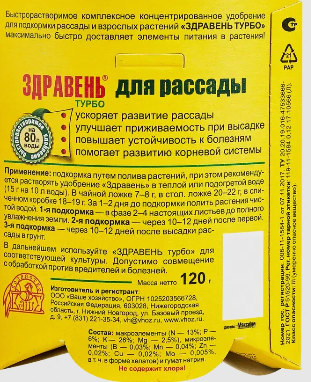 Здравень Турбо для рассады – быстрорастворимое концентрированное удобрение.