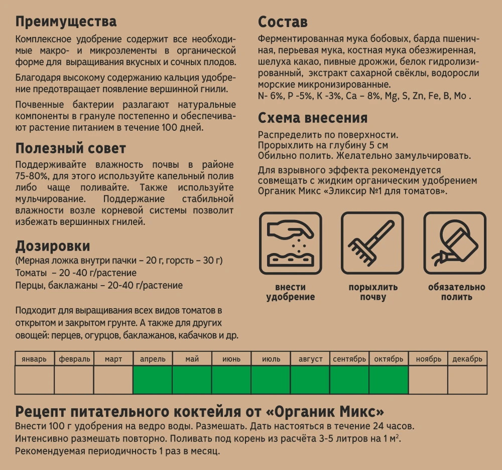 Количество товара в упаковке 10 ШтрихКод 4631147457967 Назначение удобрения или грунта Для овощей Торговая марка ОрганикМикс Форма выпуска Гранулы Вид удобрения Органические -