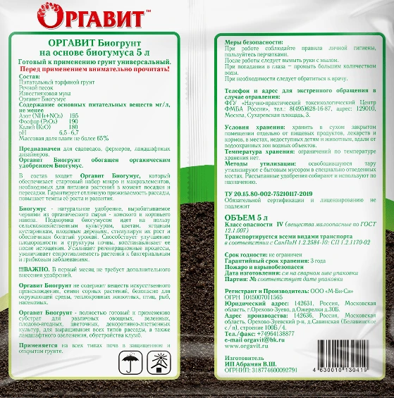 Биогумус (вермикомпост) макроэлементы, не менее: общий азот (N)- 1,8%; общий фосфор (Р) - 3,0%; общий калий (К) - 1%, органическое вещество- 20% Zn, Cu, Mn, Mo, B, Fe Влажность не более 60% pH- 6.5-7,5