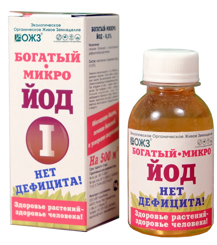Способствует обогащению урожая йодом, профилактике и лечению болезней растений.