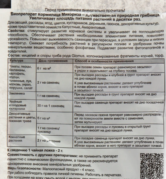 В составе препарата имеются как элементы микоризного гриба, так и колонизированные им фрагменты корней, что в разы повышает его эффективность и стабильность.