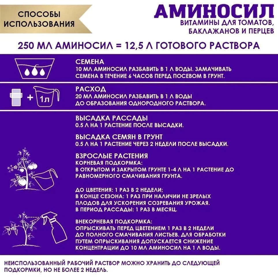 Семена: замачивать семена в получившимся растворе в течении 6 часов перед посевом в грунт.