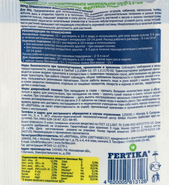 15 г растворить в 10 л воды и использовать для всех видов культур 3-5 раз в течение вегетационного периода с интервалом 10-14 дней. -