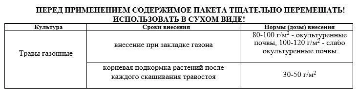 Массовая доля питательных веществ, не менее: азот (N) - 13 %, фосфор (P2O5) –5 %, калий (K2O) – 5%, магний (Mg) – 1%, сера (S) – 0,5%, кремний (Si) – 0,5%.