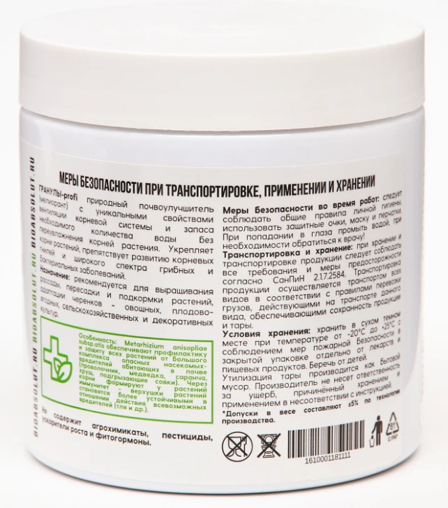 Обеспечивает профилактику и защиту всех растений от большого комплекса опасных насекомых-вредителей обитающих в почве (проволочника, медведки, саранча, хрущи, подгрызающие совки).
