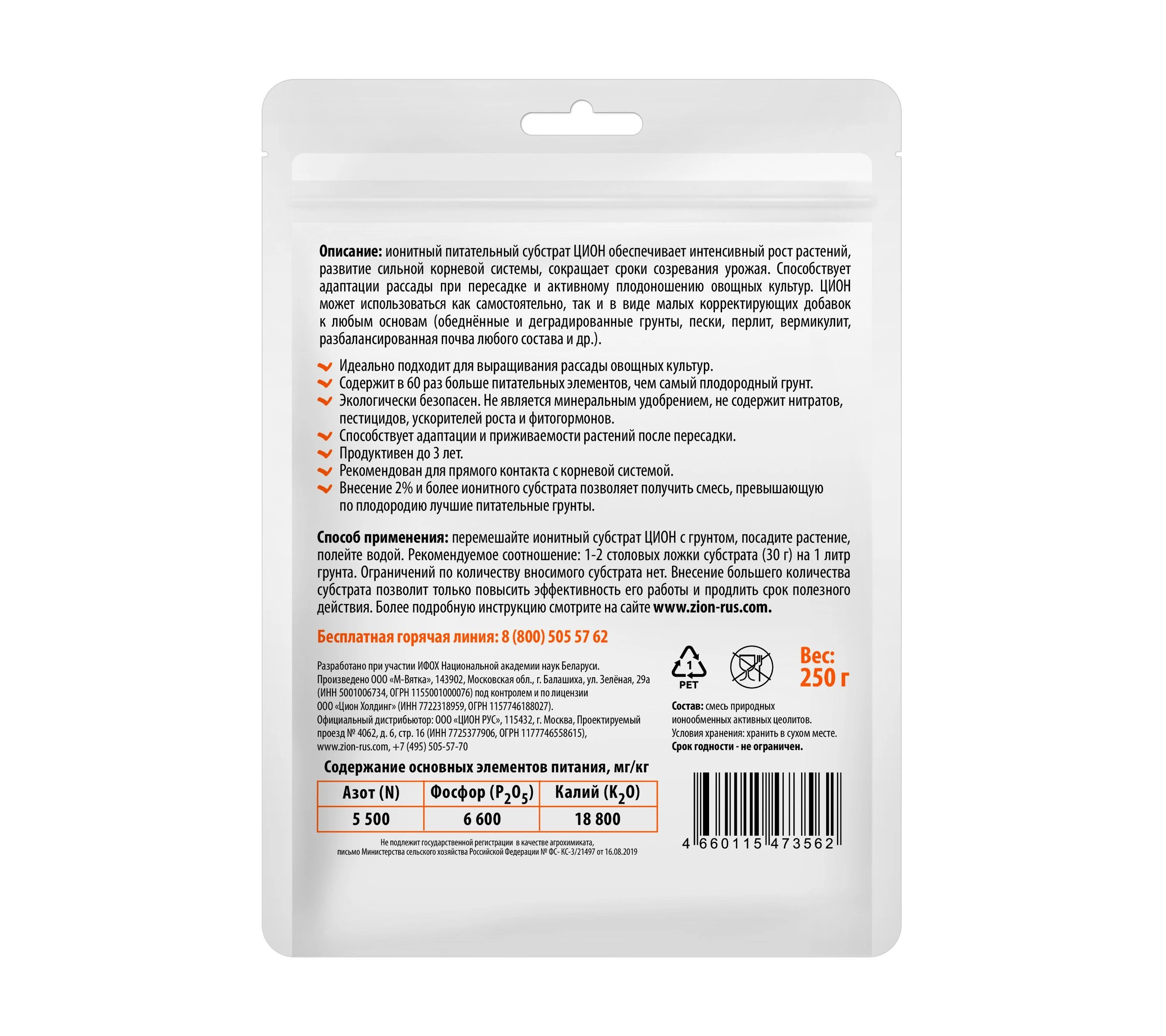 Удобрение ЦИОН для овощей ионитный субстрат 250г саше 1/80