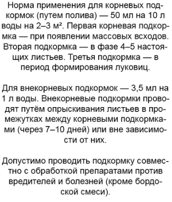 Применяется в качестве корневой и внекорневой подкормки для лука и чеснока в личных подсобных хозяйствах.