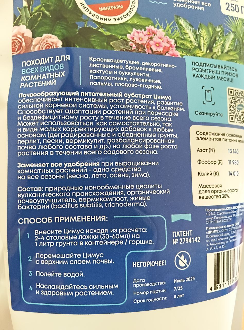 Удобрение ЦИМУС для комнатных растений субстрат 250г 1/40