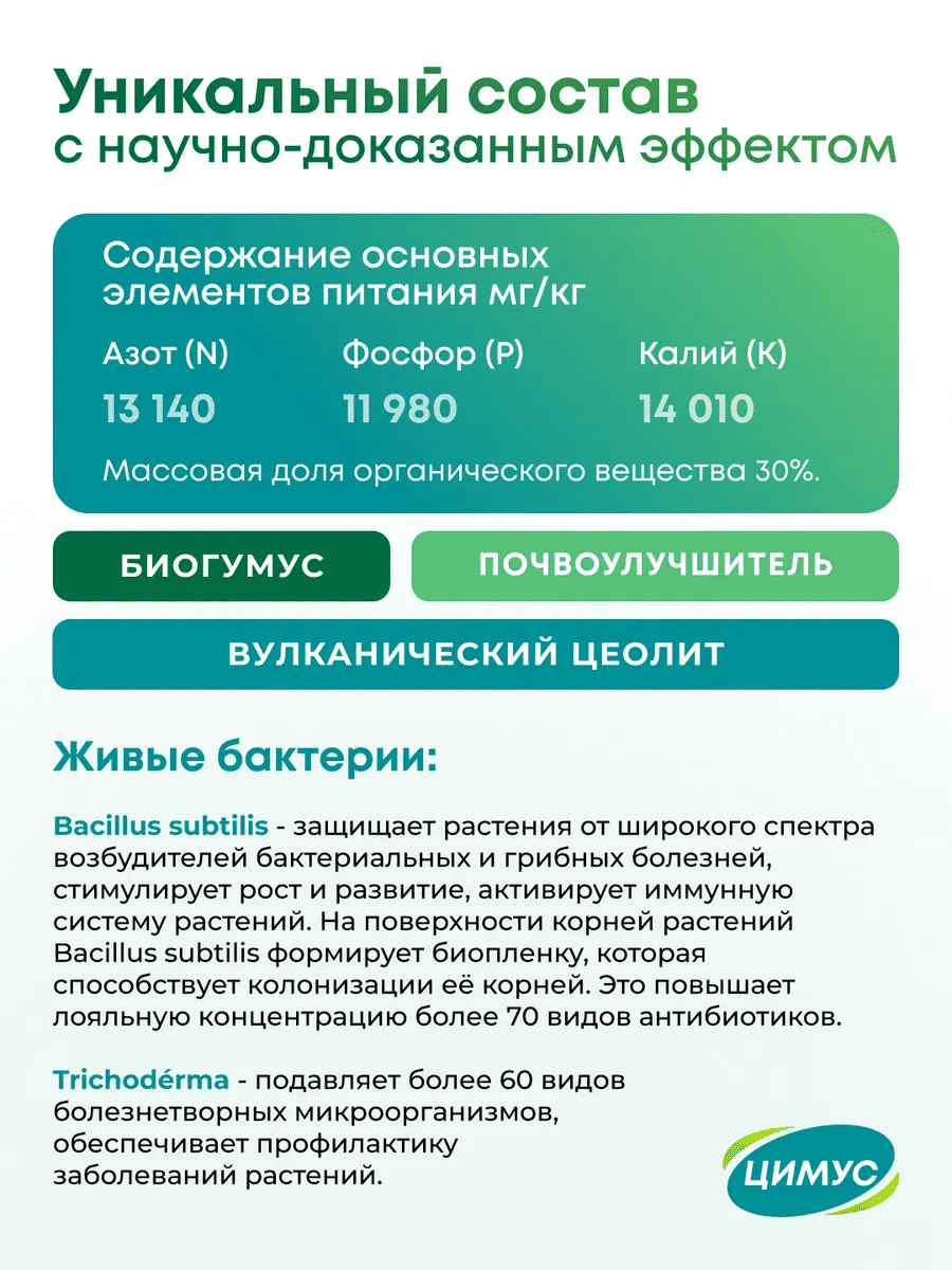 Количество товара в упаковке 40 ШтрихКод 4631175936533 Назначение удобрения или грунта Универсальное Торговая марка ЦИМУС Форма выпуска Гранулы Вид удобрения Органические -