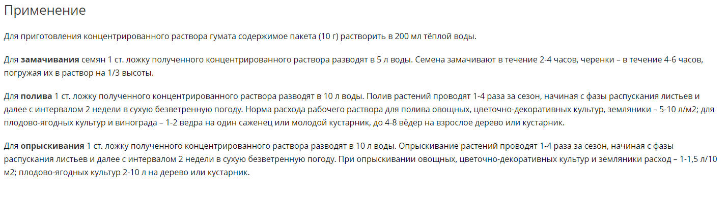 Для замачивания семян 1 ст. ложку раствора разводят в 5 л воды, а для полива и опрыскивания - в 10 л воды.