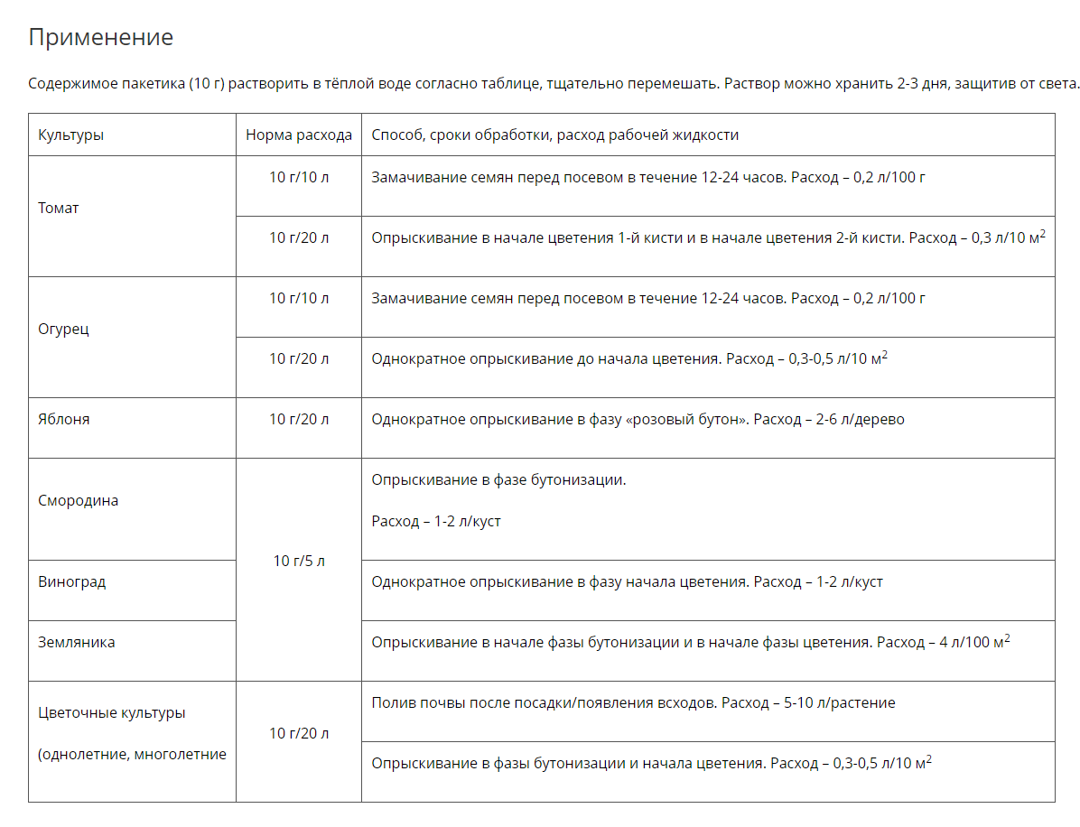 Применяется в качестве внекорневой подкормки овощных, плодово-ягодных, цветочных (комнатных и садовых), декоративных культур.