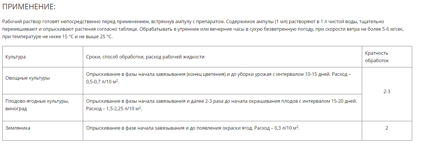 Применяется в качестве внекорневой подкормки для овощных, плодово-ягодных культур и земляники.