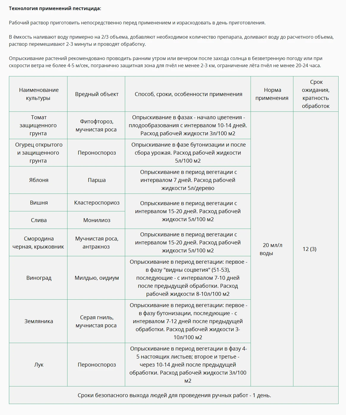 Особо ценен тем, что спасает от заражения и поражения уже созревающие плоды и ягоды;