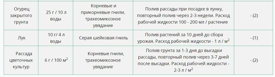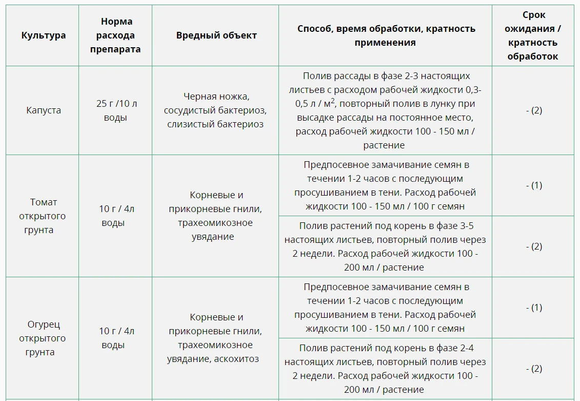 Применяется на томатах, огурцах, капусте, рассаде цветочных культур от черной ножки, сосудистого и слизистого бактериоза, корневой и прикорневой гнили, аскохитоза, серой шейковой гнили.