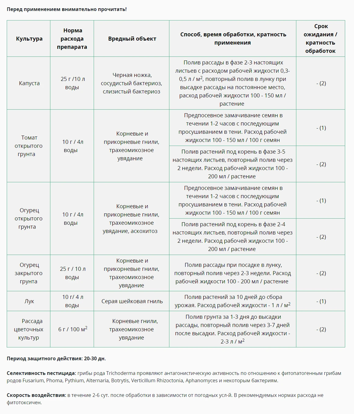 Применяется на томатах, огурцах, капусте, рассаде цветочных культур от черной ножки, сосудистого и слизистого бактериоза, корневой и прикорневой гнили, аскохитоза, серой шейковой гнили.