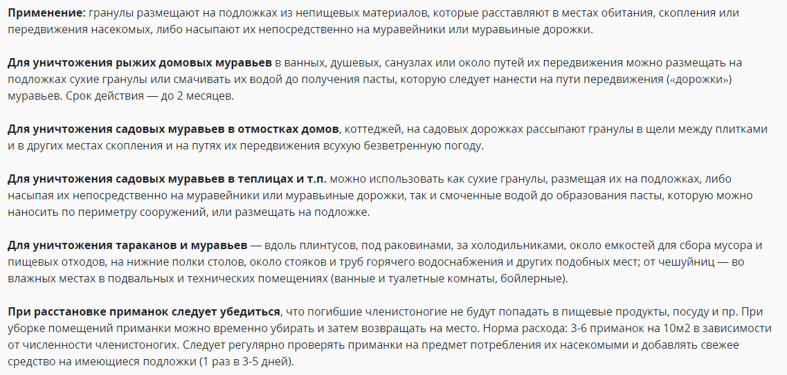 Применение: гранулы размещают на подложках из непищевых материалов, которые расставляют в местах обитания, скопления или передвижения насекомых, либо насыпают их непосредственно на муравейники или муравьиные дорожки. -
