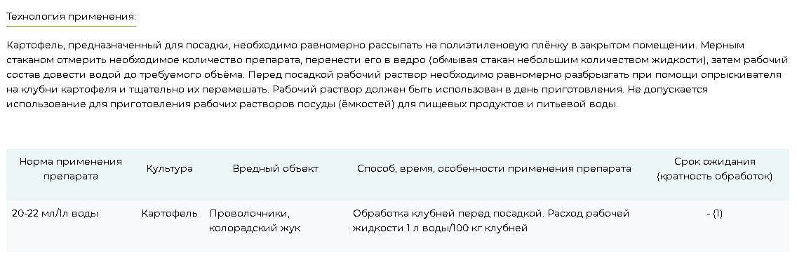 После высева клубней картофеля, препарат воздействует в двух направлениях: создает защитную пленку вокруг семени, защищая его от почвообитающих насекомых, и, по мере роста, проникает в само растение, обеспечивая длительную защиту от вредителей.
