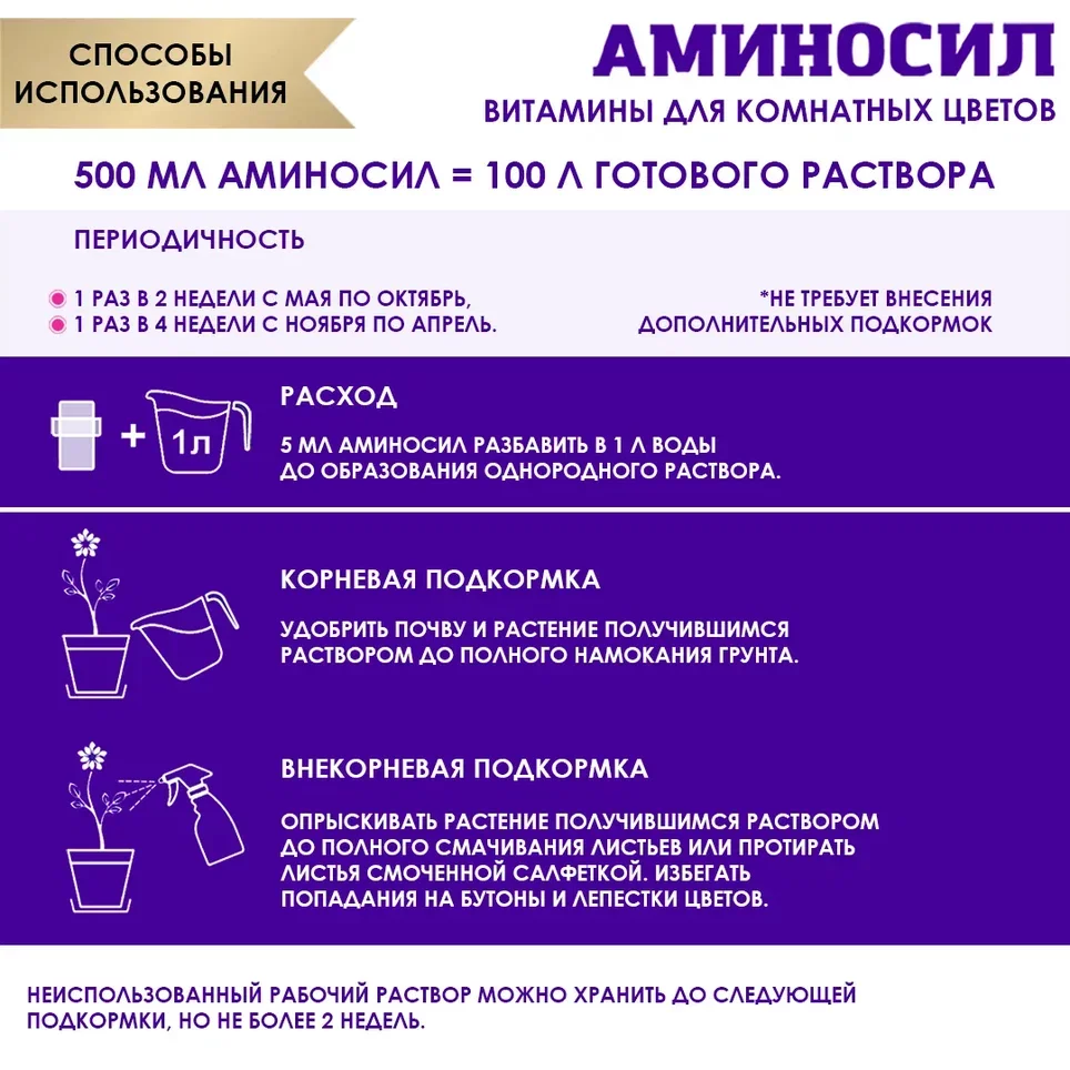 5 мл витаминного концентрата Аминосил разбавить в 1 л воды до образования однородного раствора.